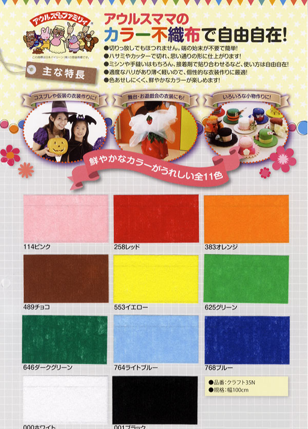 | 主な特徴 | ・切りっぱなしでもほつれません。端の始末が不要で簡単! ・ハサミやカッターで切れ、思い通りの形に仕上がります! ・ミシンや手縫いはもちろん、接着剤で貼り合わせるなど、使い方は自由自在 ・適度なハリがあり薄くて軽いので、個性的な衣装作りに最適! ・色褪せしにくく、鮮やかなカラーを楽しめます! |