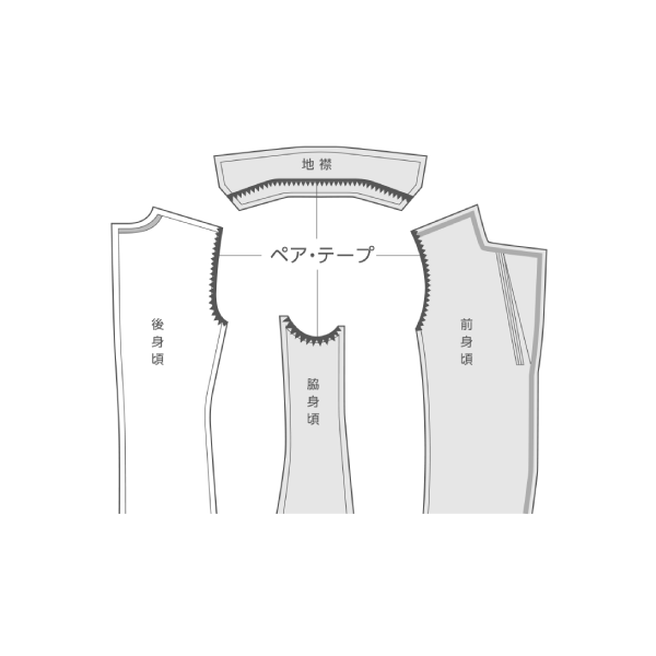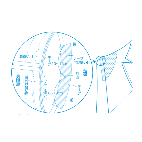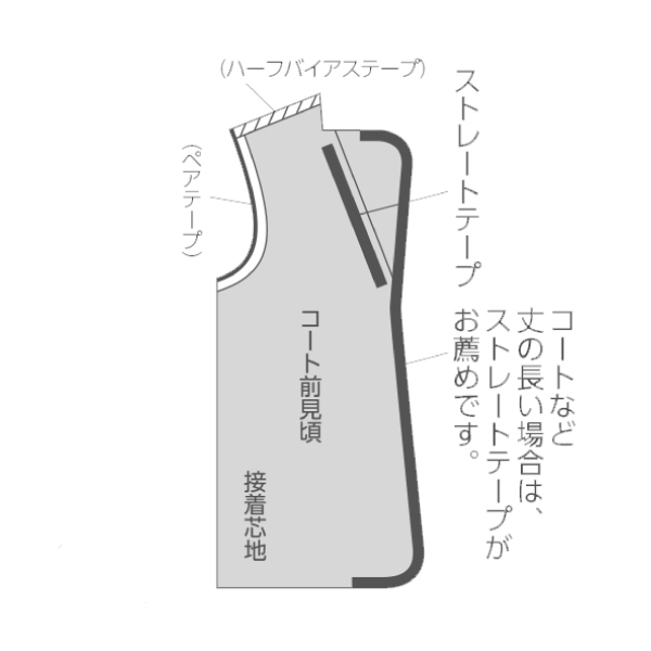 芯地とテープを使うことで、美しいシルエットをもつ洋服つくりができます。また、表素材の縫い目が安定して
